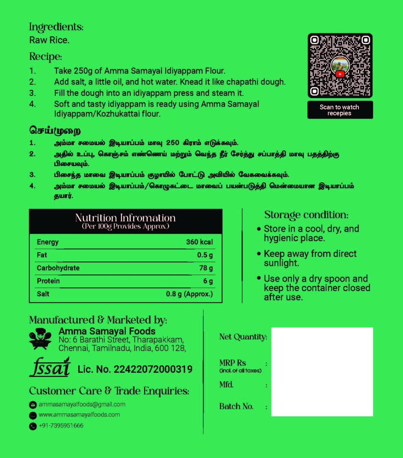 Idiyappam Preparation: Follow the easy instructions on the packaging to create soft and delicious Idiyappam. Serve with your favorite curries or coconut milk for a complete meal.