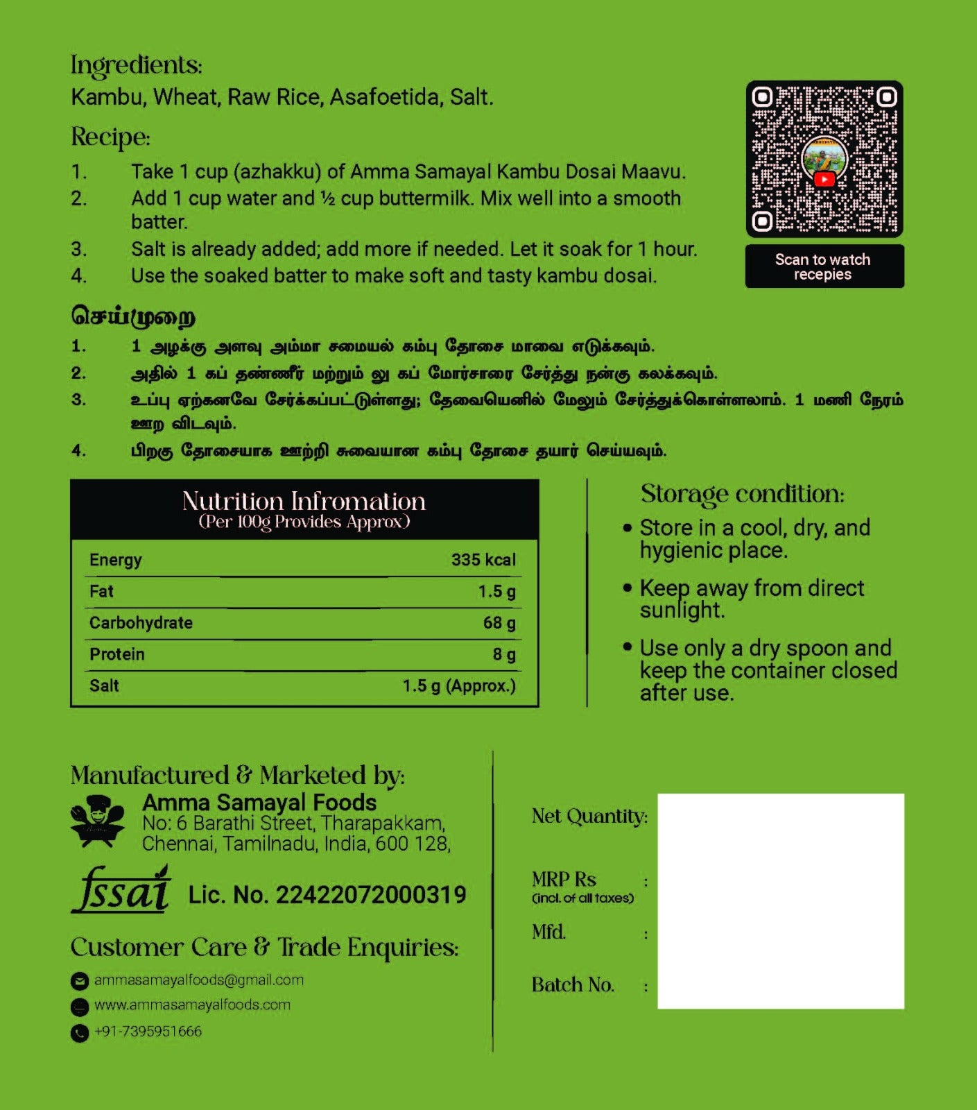 Breakfast Made Easy: Our Instant Kambu Dosai Mix is your shortcut to a delightful and nutritious breakfast. It combines high-quality Kambu and spices, ensuring a wholesome and authentic taste in every dosa.