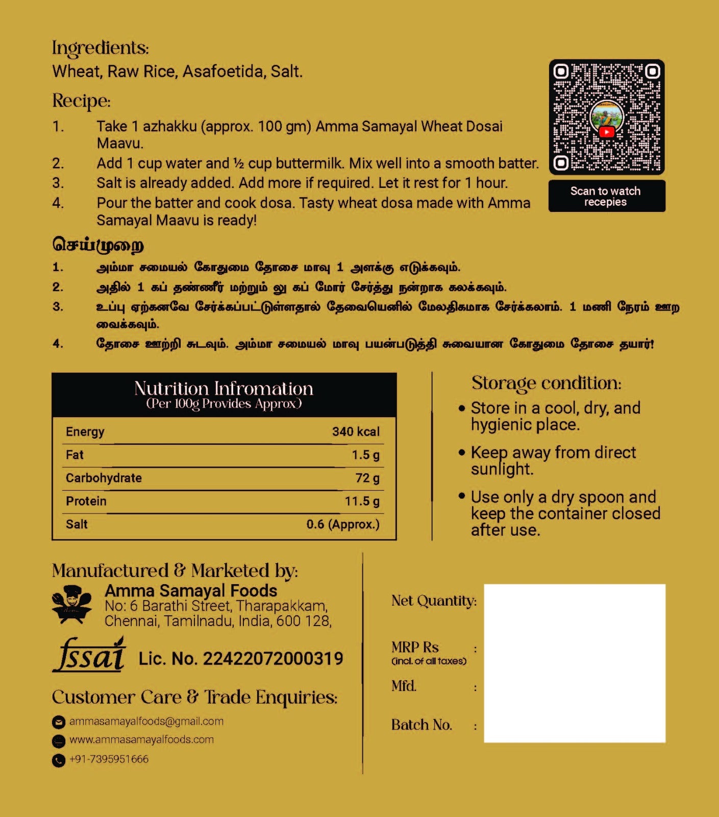 Breakfast Made Easy: Our Instant Wheat Dosai Mix is your key to a quick and delightful breakfast. It brings together a thoughtful blend of high-quality wheat and spices, ensuring a wholesome and authentic taste in every dosa. Versatile Usage: From classic dosas to innovative variations, our mix is versatile, designed to complement a range of dosa recipes.